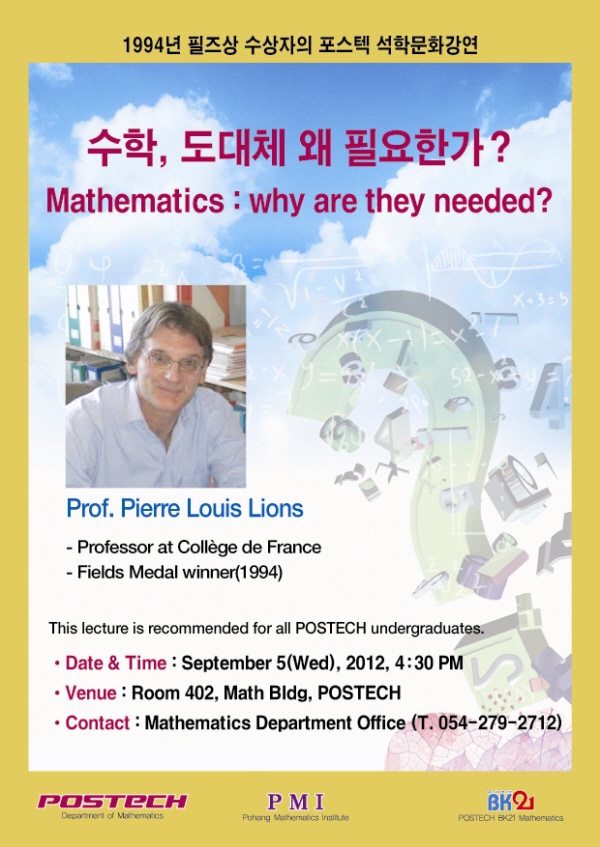 1994년 필즈상을 수상한 프랑스 수학자 피에르 루이 리옹(Pierre Louis Lions) 교수가 방한하여 “수학, 도대체 왜 필요한가?”라는 주제로 문화강연을 펼칩니다.