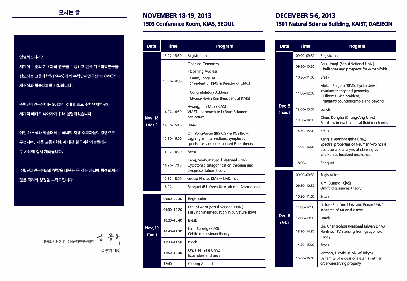 이번 학술대회는 서울 고등과학원(11월 18일~19일)과 대전 한국과학기술원(12월 5일~6일)에서 국내외 저명 수학자들의 강연으로 두 차례에 걸쳐 개최됩니다.